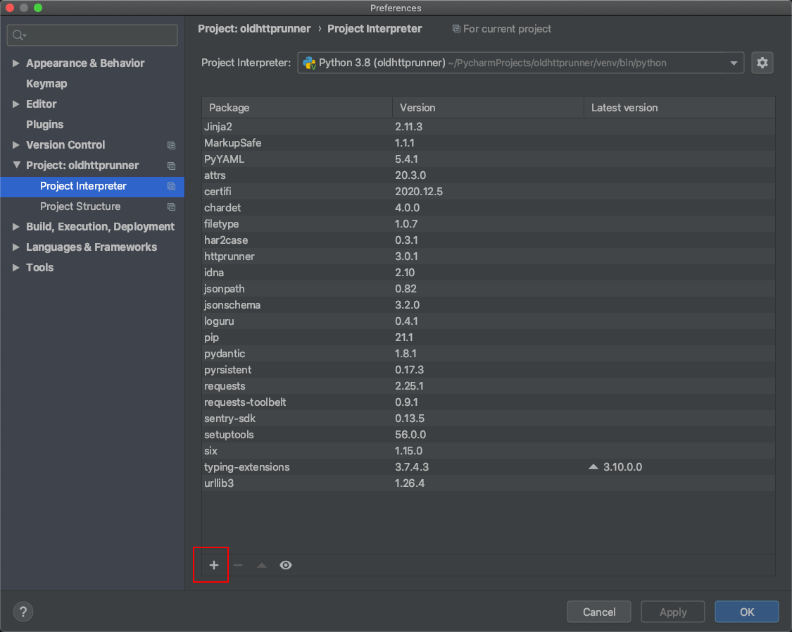 打开设置 –> Project –> Project:Interpreter –> + 号